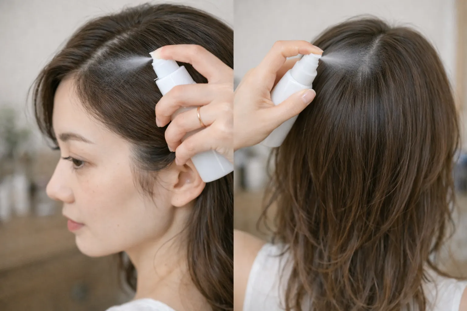 トニックを頭皮にスプレーしている横顔や後ろ姿の写真(ノズルが頭皮に向いているカット)