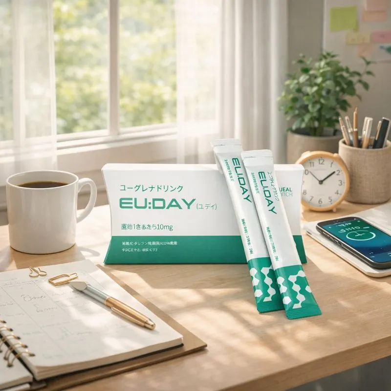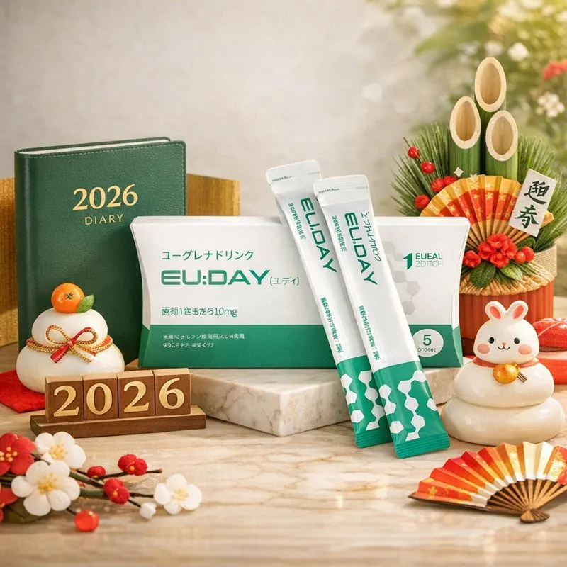 2026年のダイアリーやスケジュール帳、または新年を象徴するオブジェの横に商品を配置