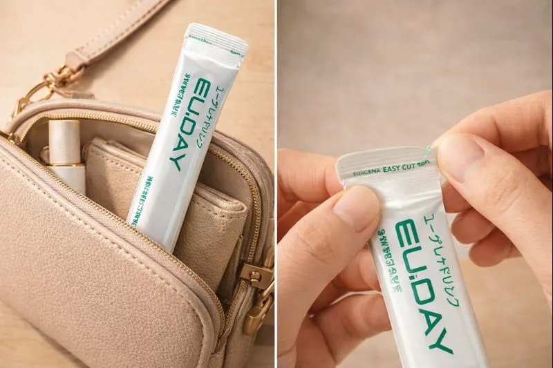 小さなお出かけ用バッグやポーチにすっと入る様子、またはイージーカット部分を軽く開ける手元のクローズアップ