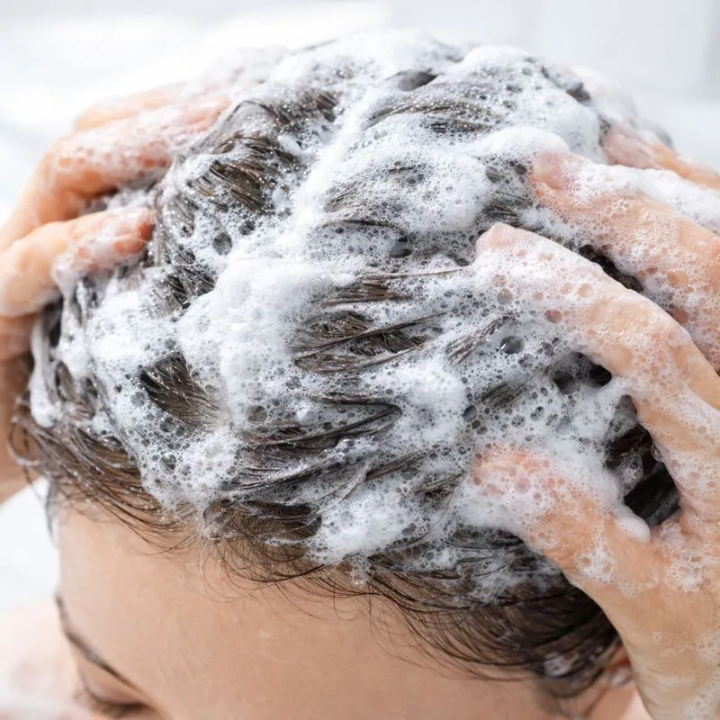 髪にシャンプーの泡をたっぷり立てている様子