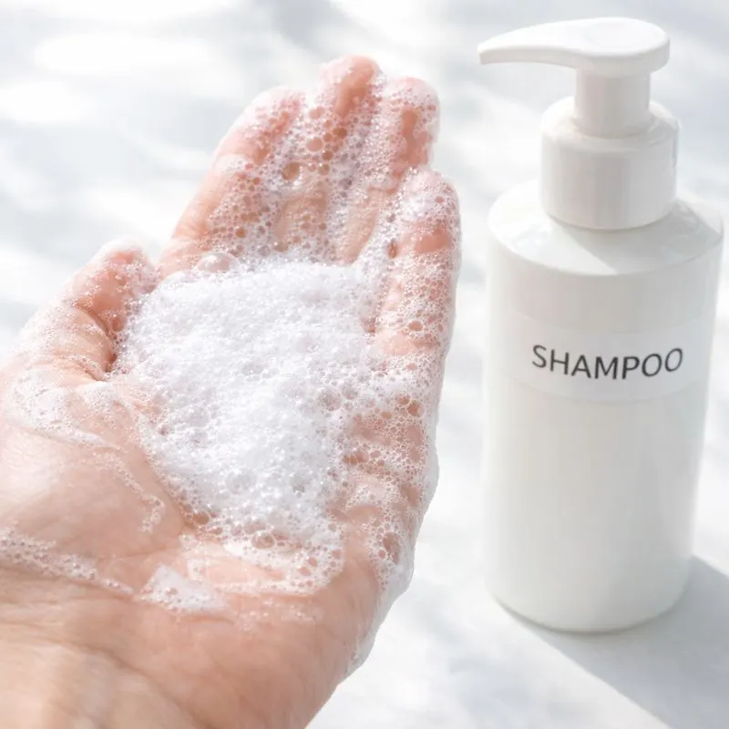 シャンプーボトルと、手のひらにしっかり泡立てたカットを1枚
