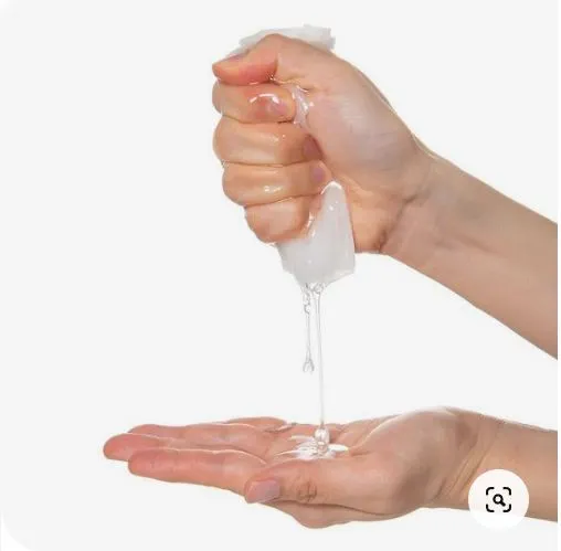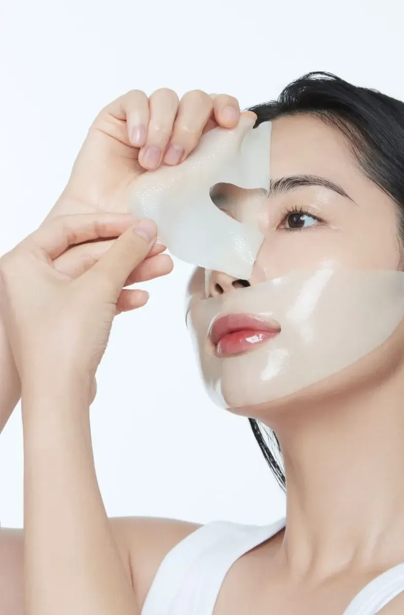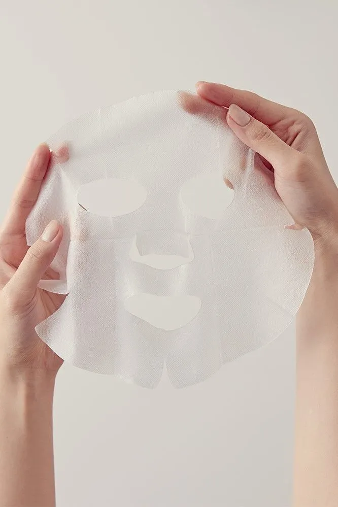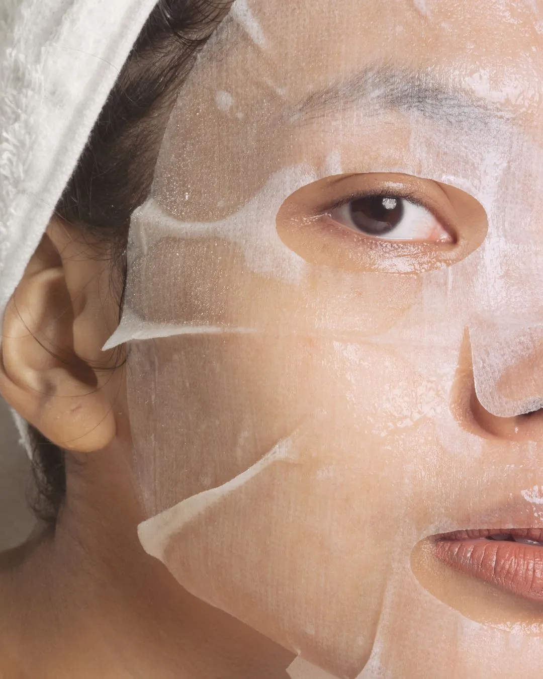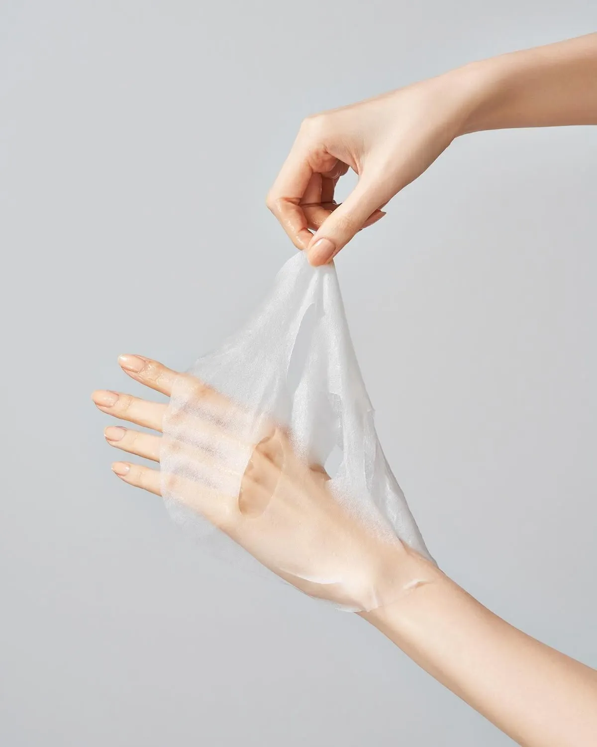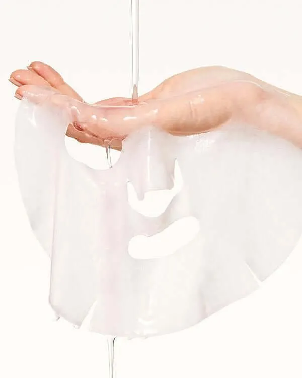 1) 手のひらにマスクの美容液(エッセンス)がのったアップカット